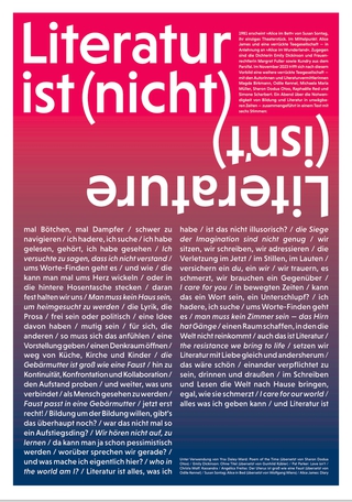 "Literatur ist ..." auch ein Kollaborativ-Text mit den Stimmen von Magda Birkmann, Odile Kennel, Michaela Maria Müller, Raphaelle Red, Sharon Dodua Otoo & Simone Scharbert.